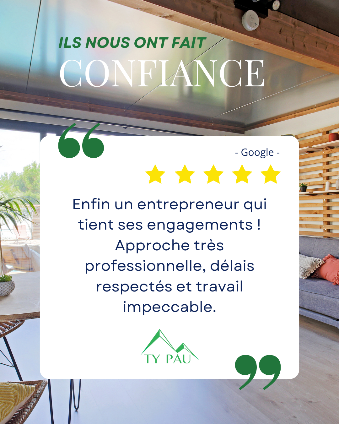 Choisir un artisan pour ses menuiseries est une décision importante. Au-delà des produits, ce sont surtout les engagements, le sérieux et la fiabilité qui font la différence. Chez Ty Pau, ces valeurs ne sont pas de simples promesses : elles se traduisent concrètement sur chaque chantier, comme en témoigne un avis client récent. Pour mieux comprendre l’approche de l’entreprise, découvrez également leur expertise sur la page À propos et leurs réalisations concrètes sur leurs chantiers.